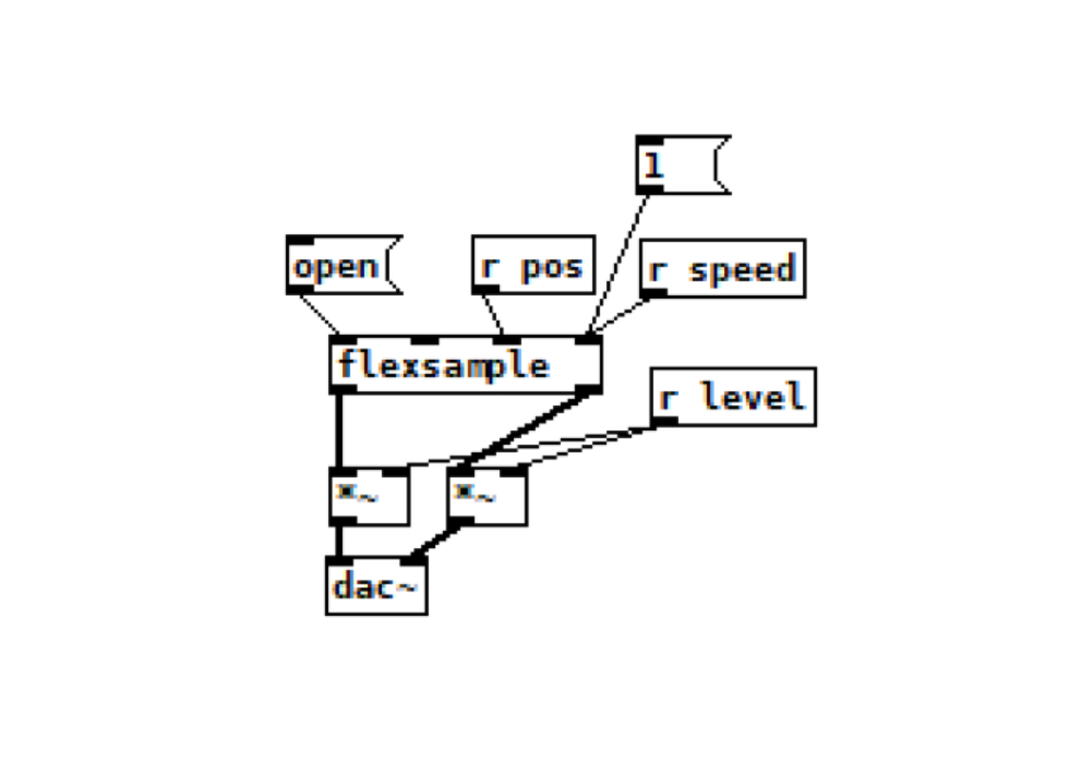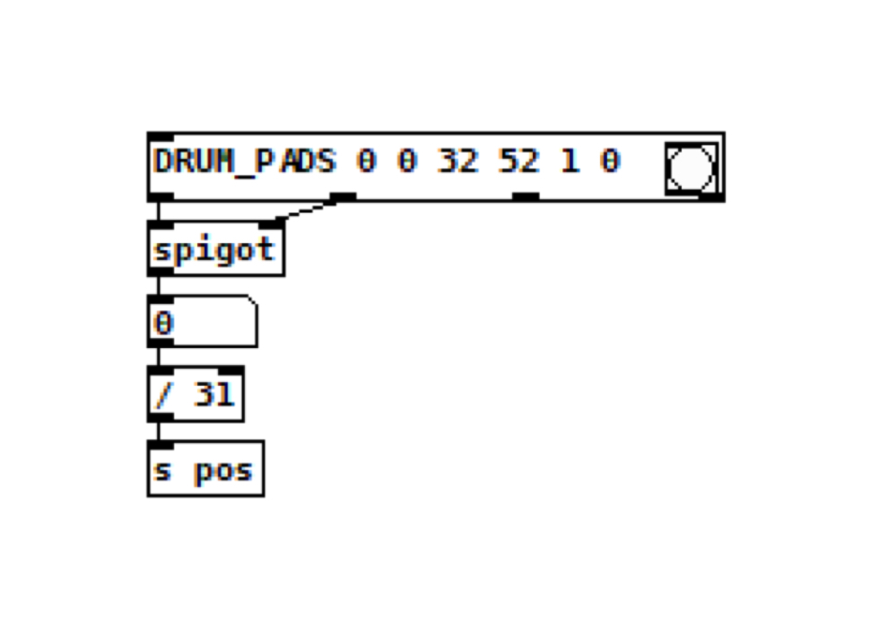 Just connect the outlet with the pad ID to the left of spigot, and the velocity to the right (the right-hand inlet is what’s switching the spigot on and off). Position will go from left to right, bottom to top, so the beginning of our sample will be at the lower left, and end of the sample at the upper right. Connected, the DRUM_PADS object looks like this: