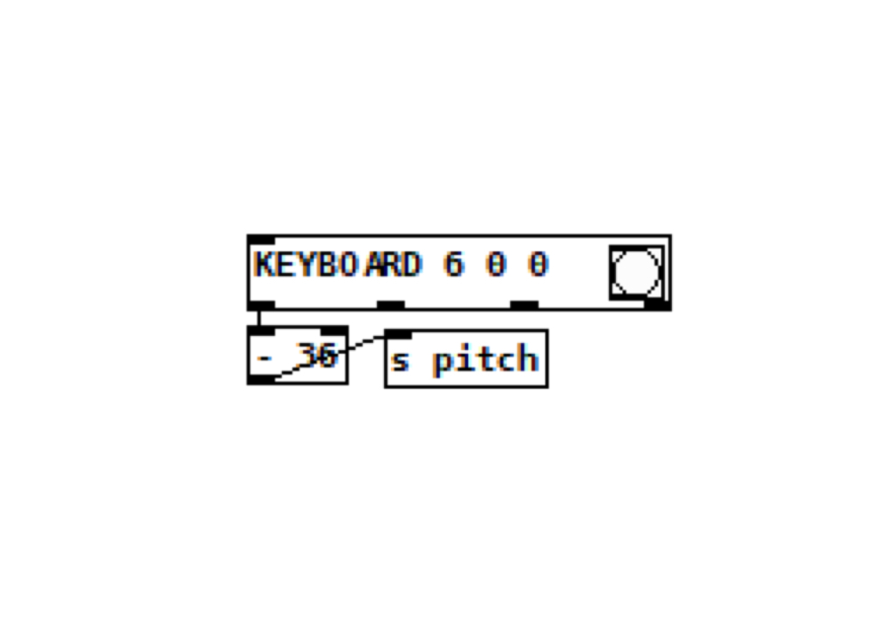 In addition to arguments, we can find out what the mysterious black notches on the bottom do and query outlets. Click the bang — that’s the circle in a square on the right-hand side of the KEYBOARD object — and look at the Pd window. (Window > Pd Window, if it’s hidden.) There in the console you’ll see arguments, methods (like transposition or octave changes), and outlets. So we know that we can read pitch, velocity, aftertouch, and polytouch from that object, assuming you have a Launchpad that supports it. We’ll use this keyboard for pitch in a bit, but let’s move on and draw the rest of our interface.