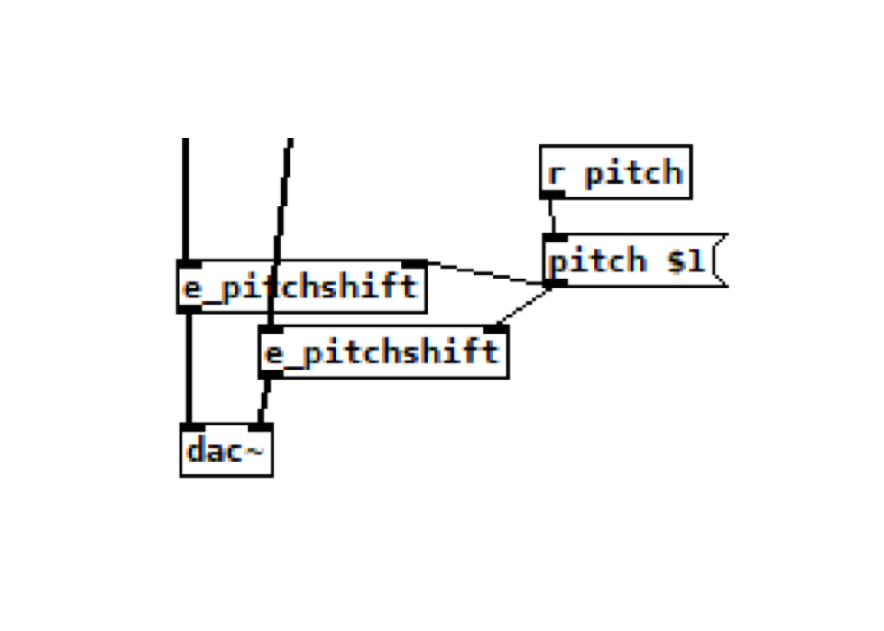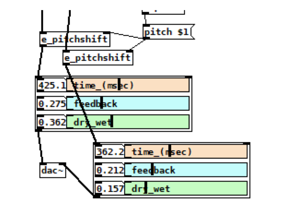 One last trick: we’ll use the keyboard to re-pitch the audio signal, using one of RJLib’s clever objects. Add e_pitchshift to each signal before the dac~, and send the value of the keyboard to change pitch.