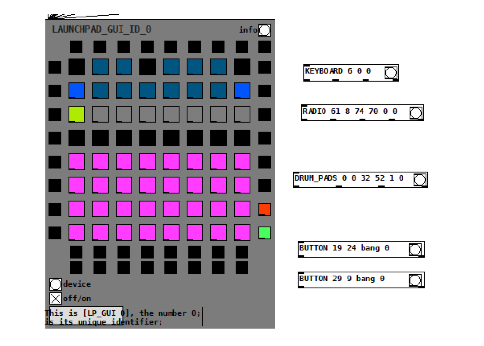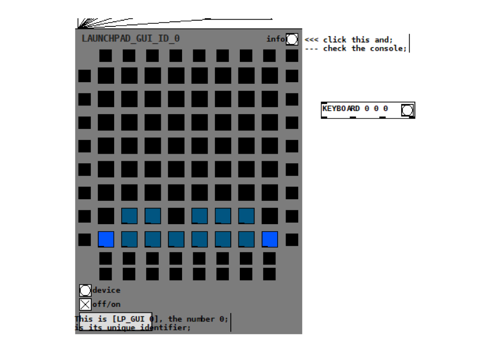 Turn on the GUI. This will synchronise what you see on the Launchpad with what’s in your Pd patch and in the preview in LAUNCHPAD_GUI. Initially, the Launchpad will darken.