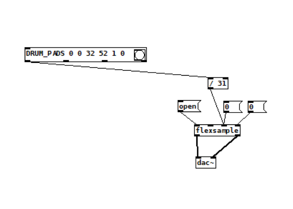 But this gets more interesting once we input something from the Launchpad. Connect the first outlet (pad ID) from the DRUM_PADS object to a [ / 31 ] object (1 less than the 32 pads), and then to the third inlet on [flexsample], which represents position. Now as you play pads on that 8x4 grid, you’ll trigger different positions in the sample.