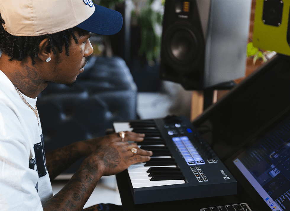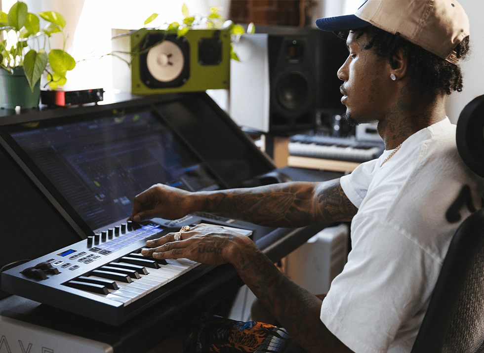 Once he’s happy with his finished beat, Lex Luger uses the knobs on FLkey to bring the mixer controls of FL Studio into his hands. He hits record on the keyboard while adjusting his mix to record automation live into FL Studio for a more dynamic beat.