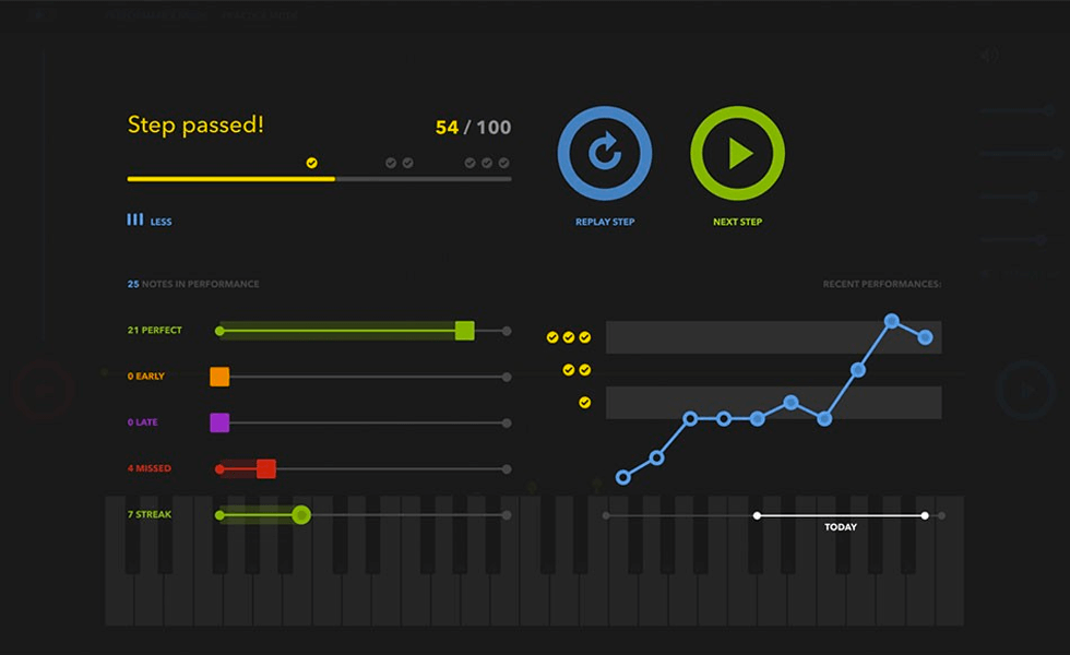 Because Melodics is constantly learning from its users’ everyday habits, Sam and his team of developers are able to use the player’s habits (good and bad) to influence Melodics’ practice algorithms. “One of the things we have learned a lot about over the last few years is some of the science behind practice — because Melodics is fundamentally a ‘practice’ tool, rather than a ‘learning’ tool. Our research has helped to back up some established assumptions like ‘you should not practice mistakes; practicing with mistakes is bad because you reinforce those mistakes’. So we’ve got tools to help you take a section, break it up, loop it, slow it down, get it right, and then repeat it and build it up to full speed. You can really work on nailing the hard bits, then incorporate them into the wider piece, rather than just repeating your mistakes.”