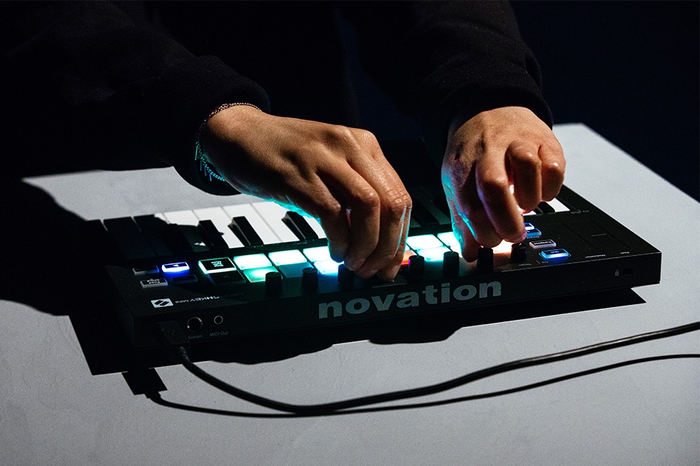The final shoot was “a wild experience,” she remembers. With Covid restrictions in place, Ikonika was left alone in the dark, standing on a tiny stage with the Launchkey Mini for company. “Everyone was so far away from me. It was a bit surreal, but it also made sense because of the track and the visuals — the way everyone was part of it but not part of it. There was a disconnect and I think it made sense with our work.” For once, a socially distanced performance felt like an artistic decision. “Our collaboration is made for club music in an empty space,” she laughs, “for nobody to listen to.”